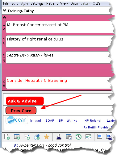 · The Preventative Care button will show red if there are overdue preventative care tests