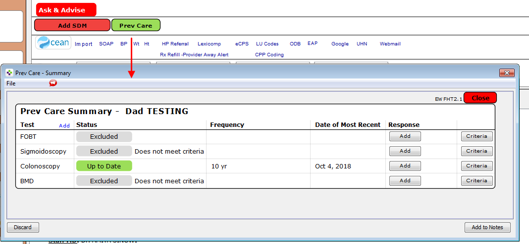· Click the Preventative Care button to display the last date of the test, frequency and criteria for tests