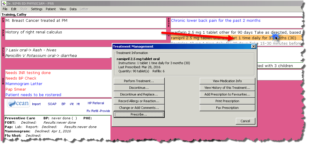 Note that the medication information appears at the top of this window
