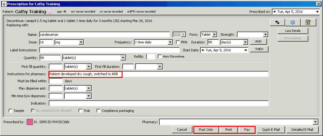 Fill in all fields. Add in any instructions for pharmacy in the Instructions