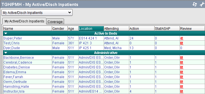 · Inpatients that you have assigned to yourself. These patients will remain on this list until you un-assign them (found under Active or Active in Beds header)