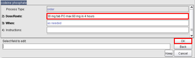 4. A list of options is displayed on the screen. To modify the order, you must select the choice that is consistent with the as needed dose range narcotic order. The dose selected must give you the option to enter the minimum and the maximum dose in a specified time frame. Click on the dosage option, and then click on the OK button to continue.